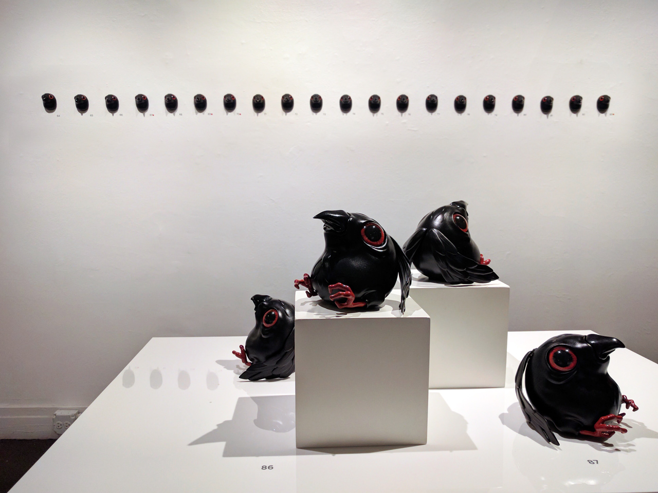 Presented as an installation featuring 20 small wall mounted black bird busts and 4 larger birds sitting on a pedestal nearby.