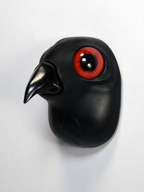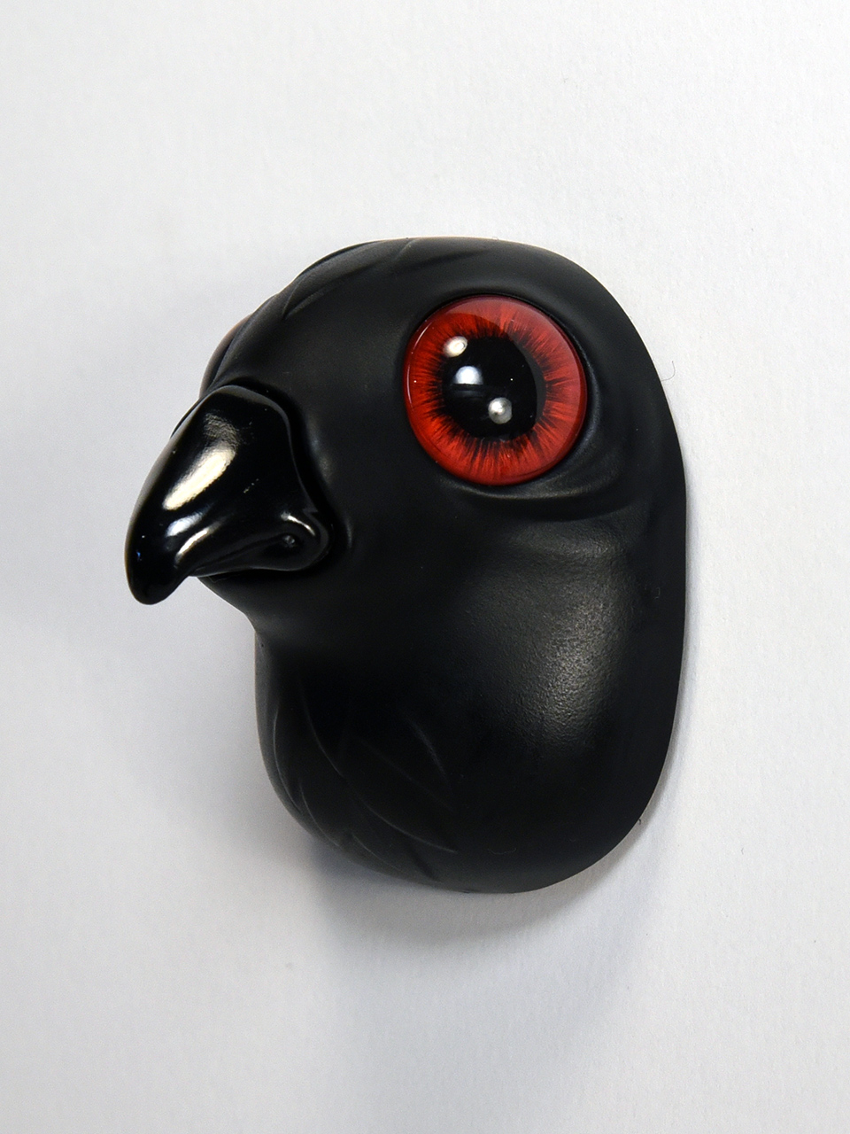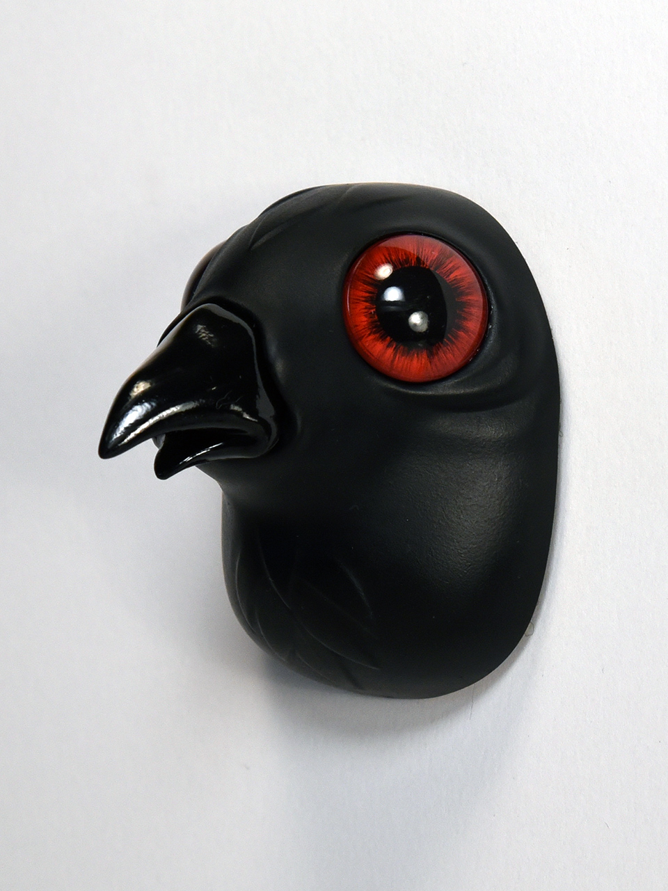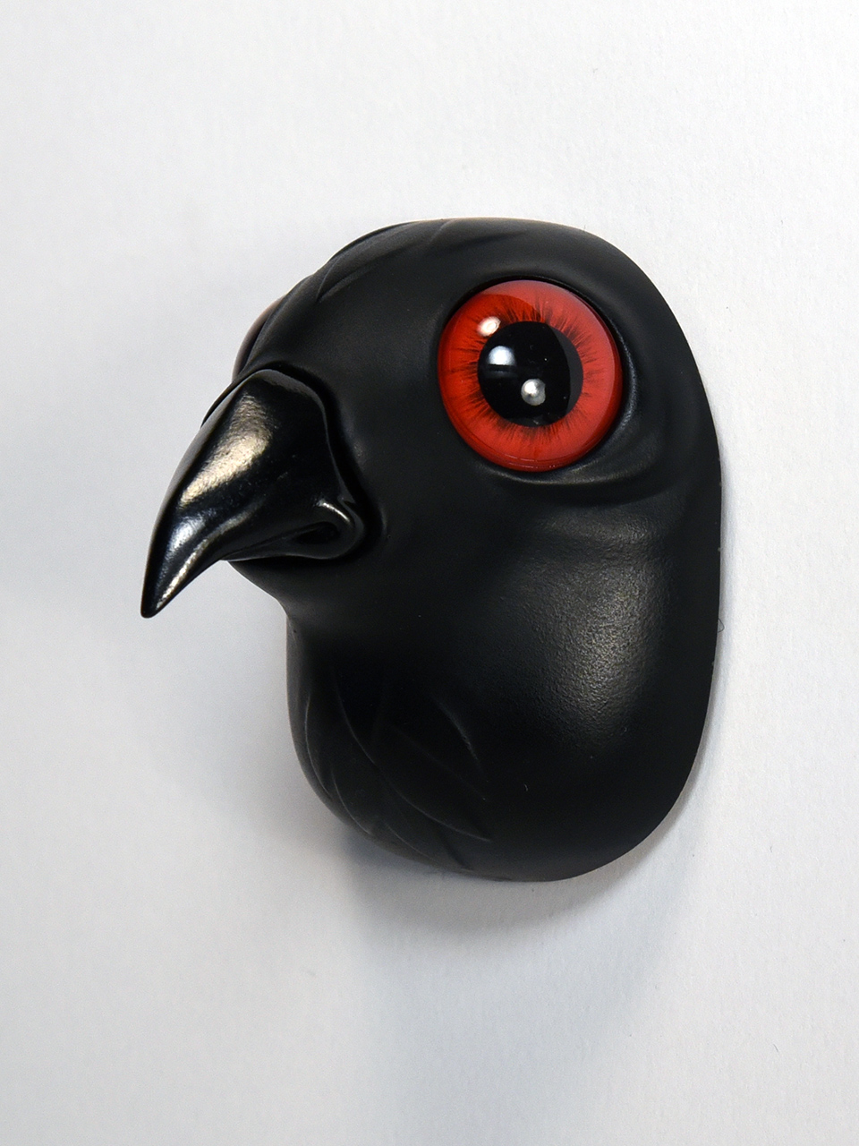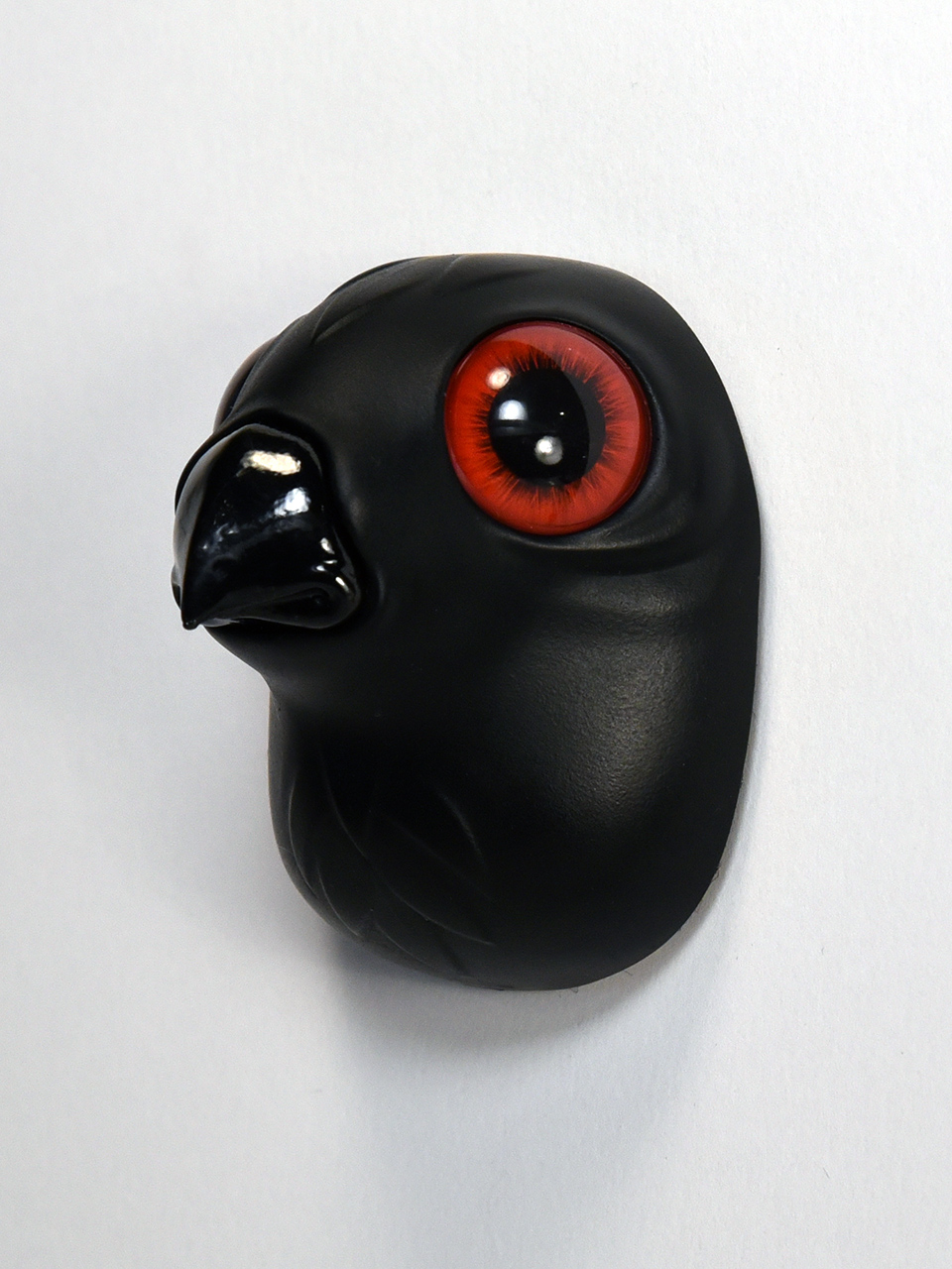 Presented as an installation featuring 20 small wall mounted black bird busts and 4 larger birds sitting on a pedestal nearby.