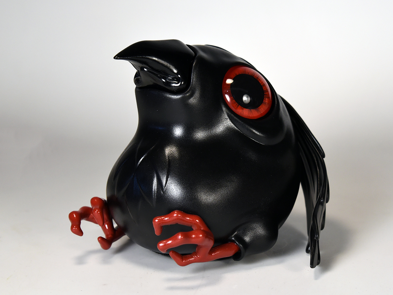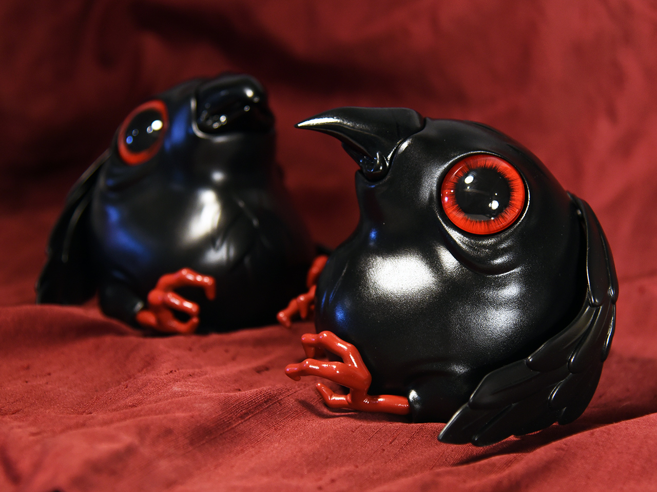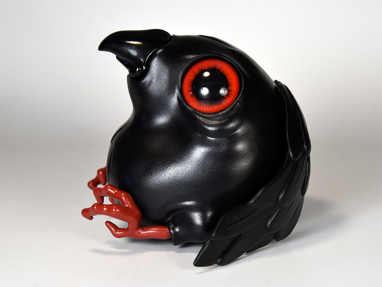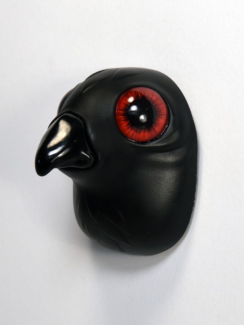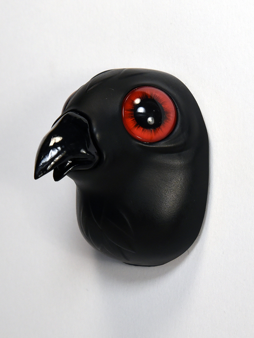 Presented as an installation featuring 20 small wall mounted black bird busts and 4 larger birds sitting on a pedestal nearby.