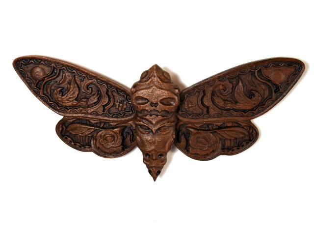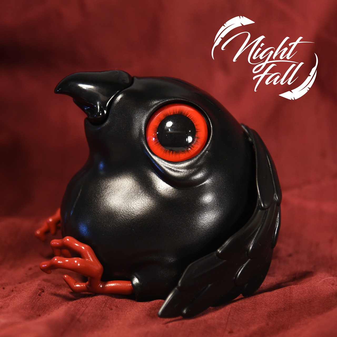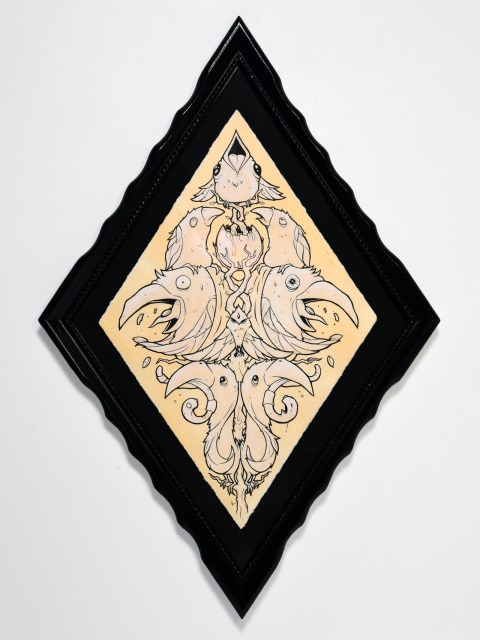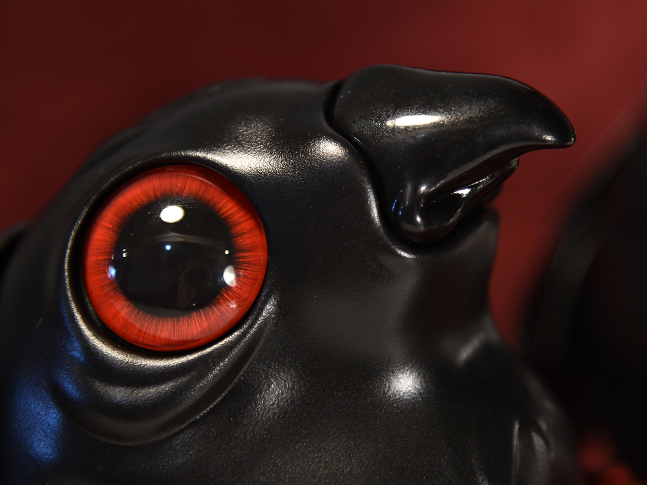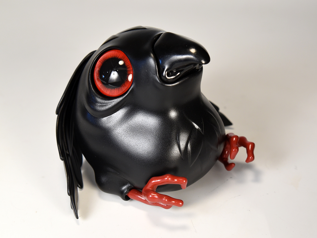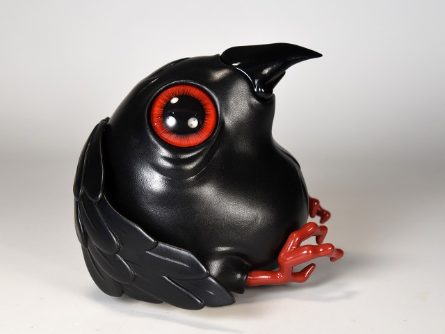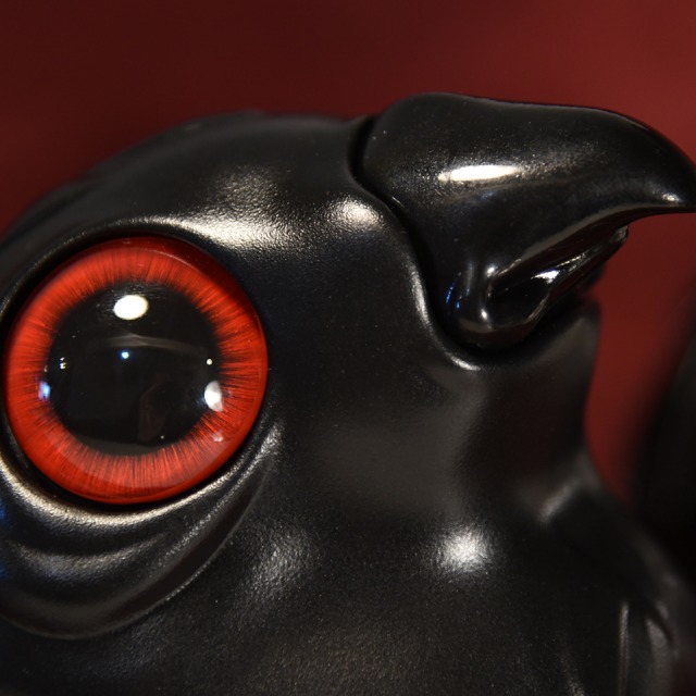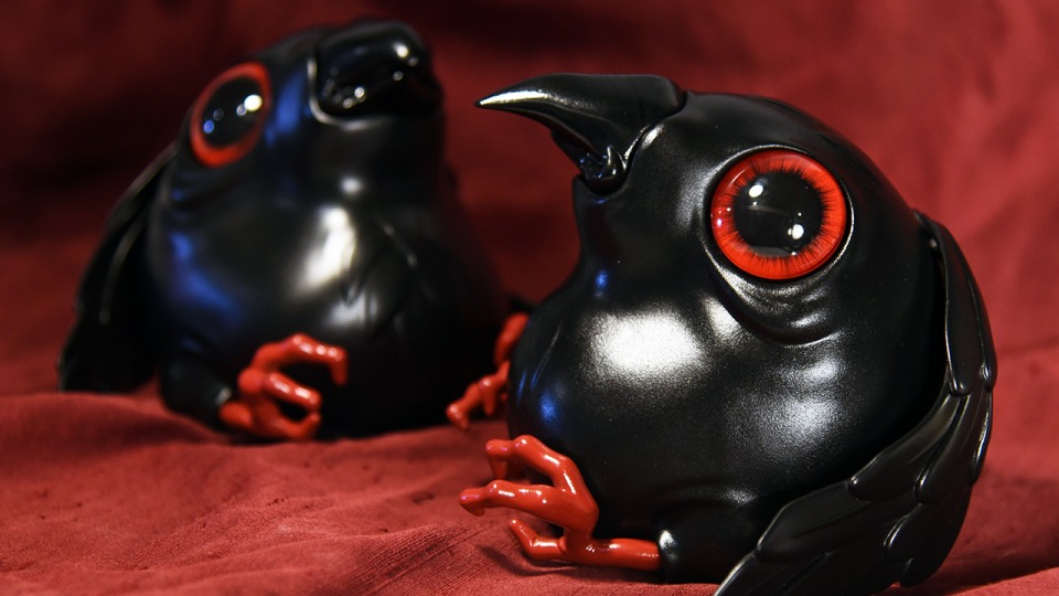 Presented as an installation featuring 20 small wall mounted black bird busts and 4 larger birds sitting on a pedestal nearby.