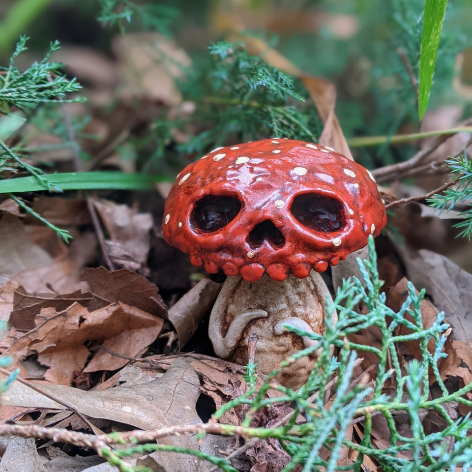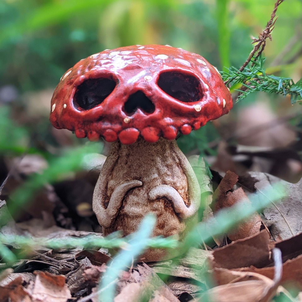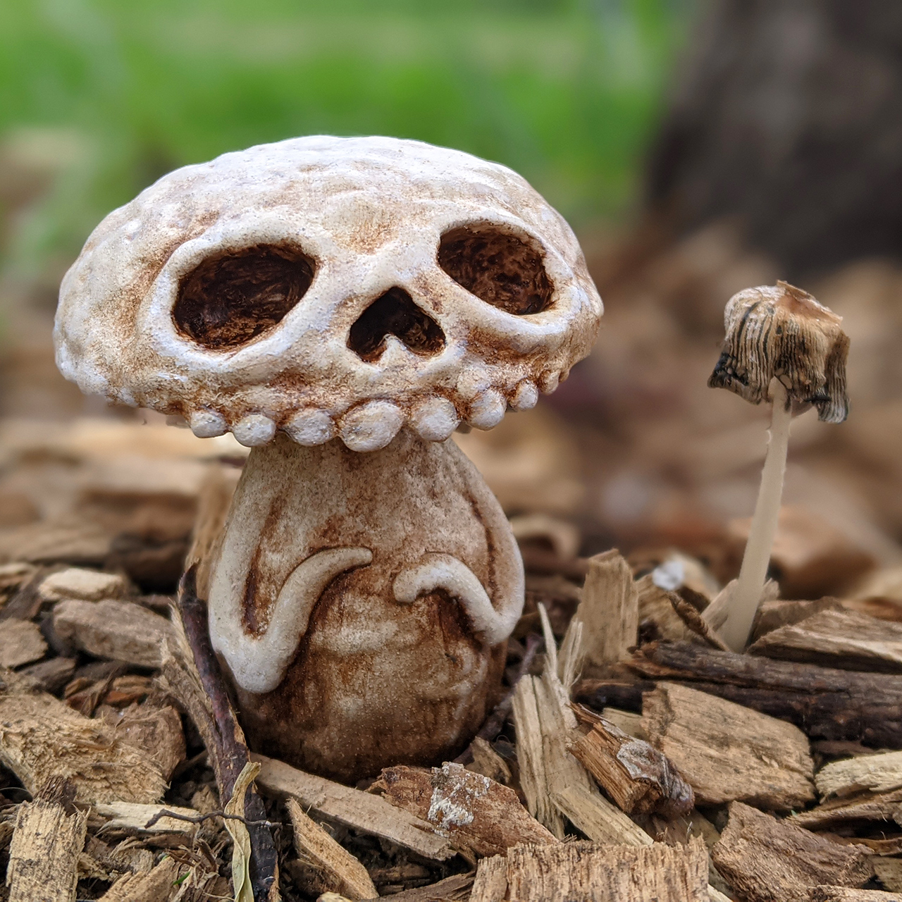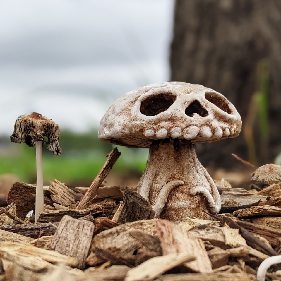Two one-off mushroom sculptures hidden in my neighborhood for Game of Shooms global art scavenger hunt.