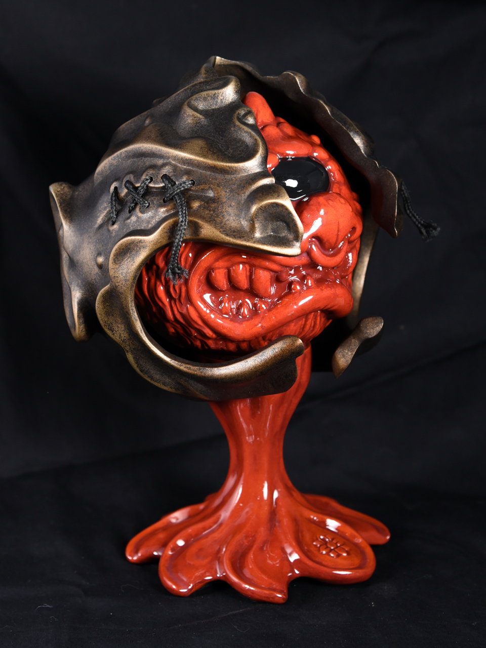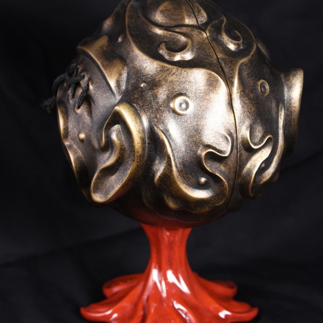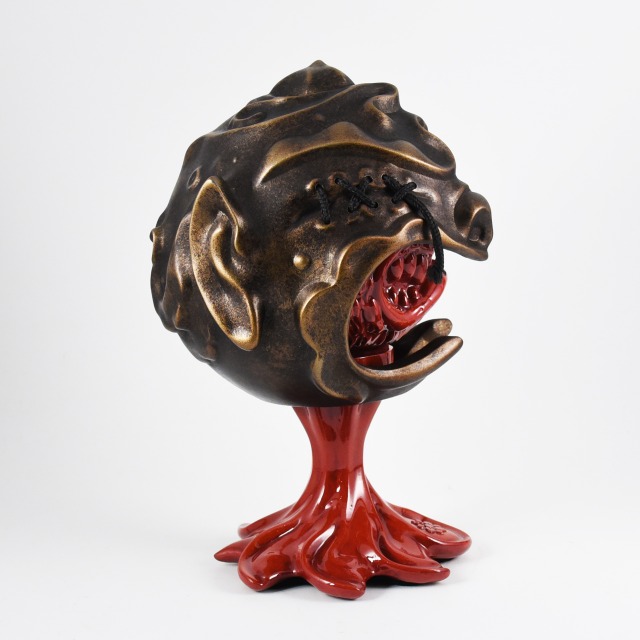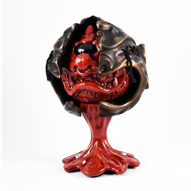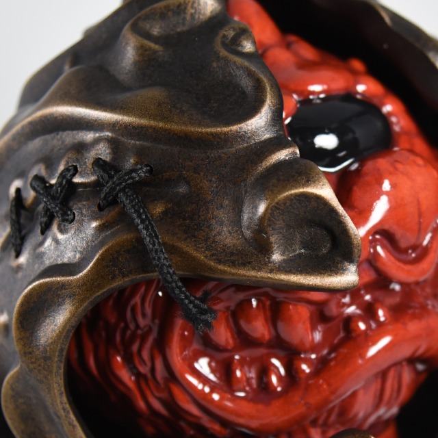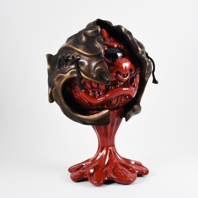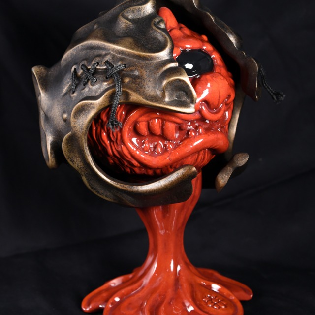 Custom sculpted two-part mask and stand supporting painted vinyl figure. Exhibited as part of the MadBall All-Star Art Jam at Myplasticheart NYC