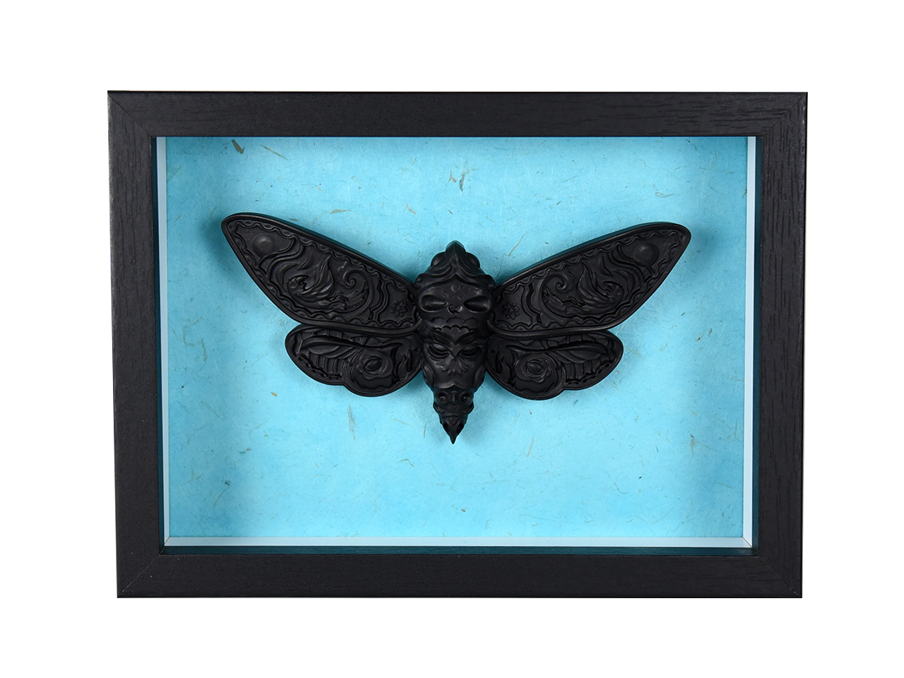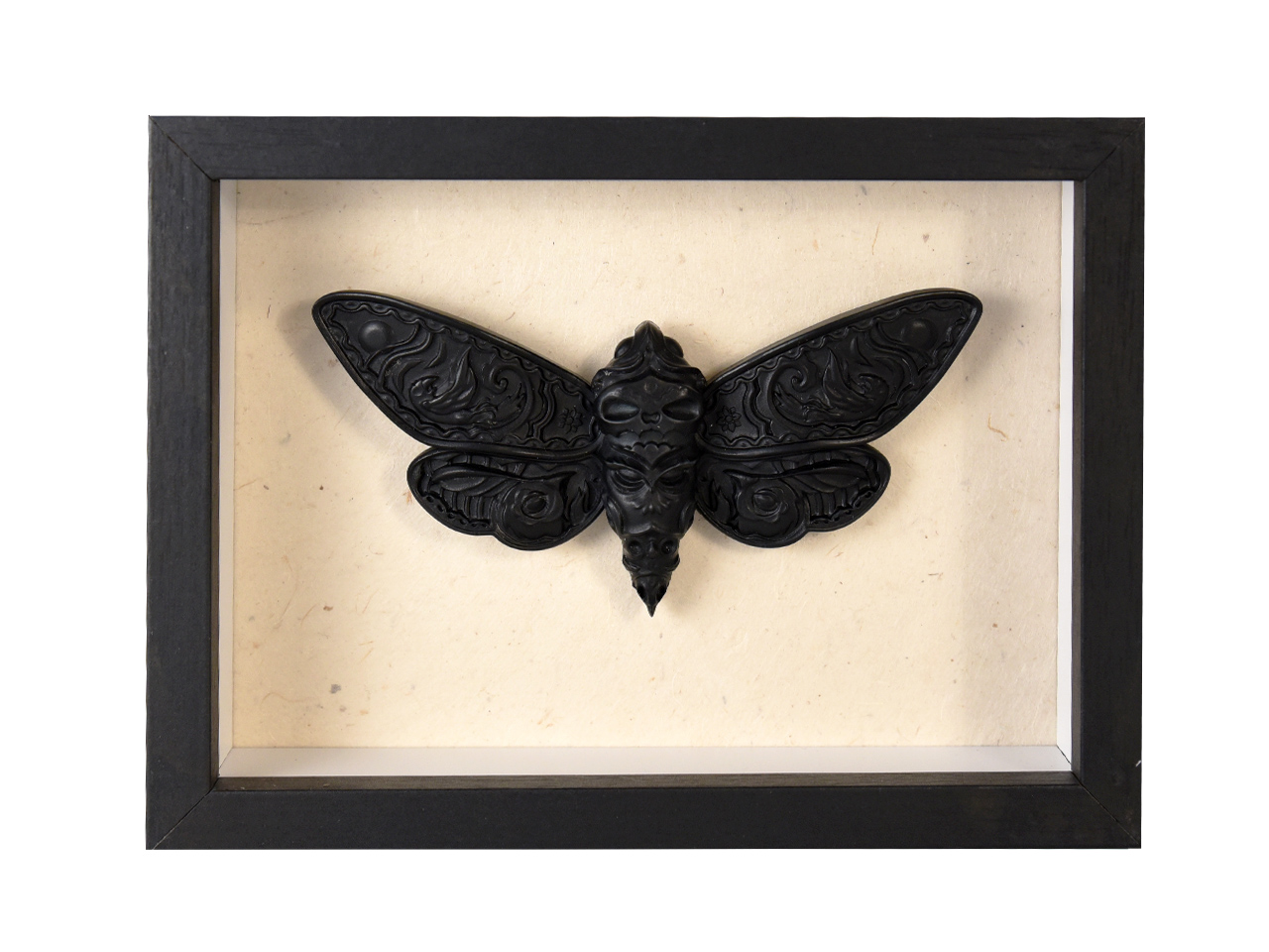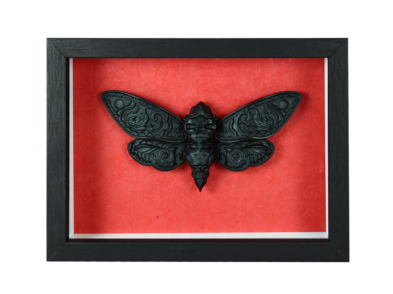 These smaller resin and metal editions of The Fall feature subtle finishes and softly curved wings. Mounted into a shadow box with natural paper backdrop, they exist somewhere between sculpture and specimen.