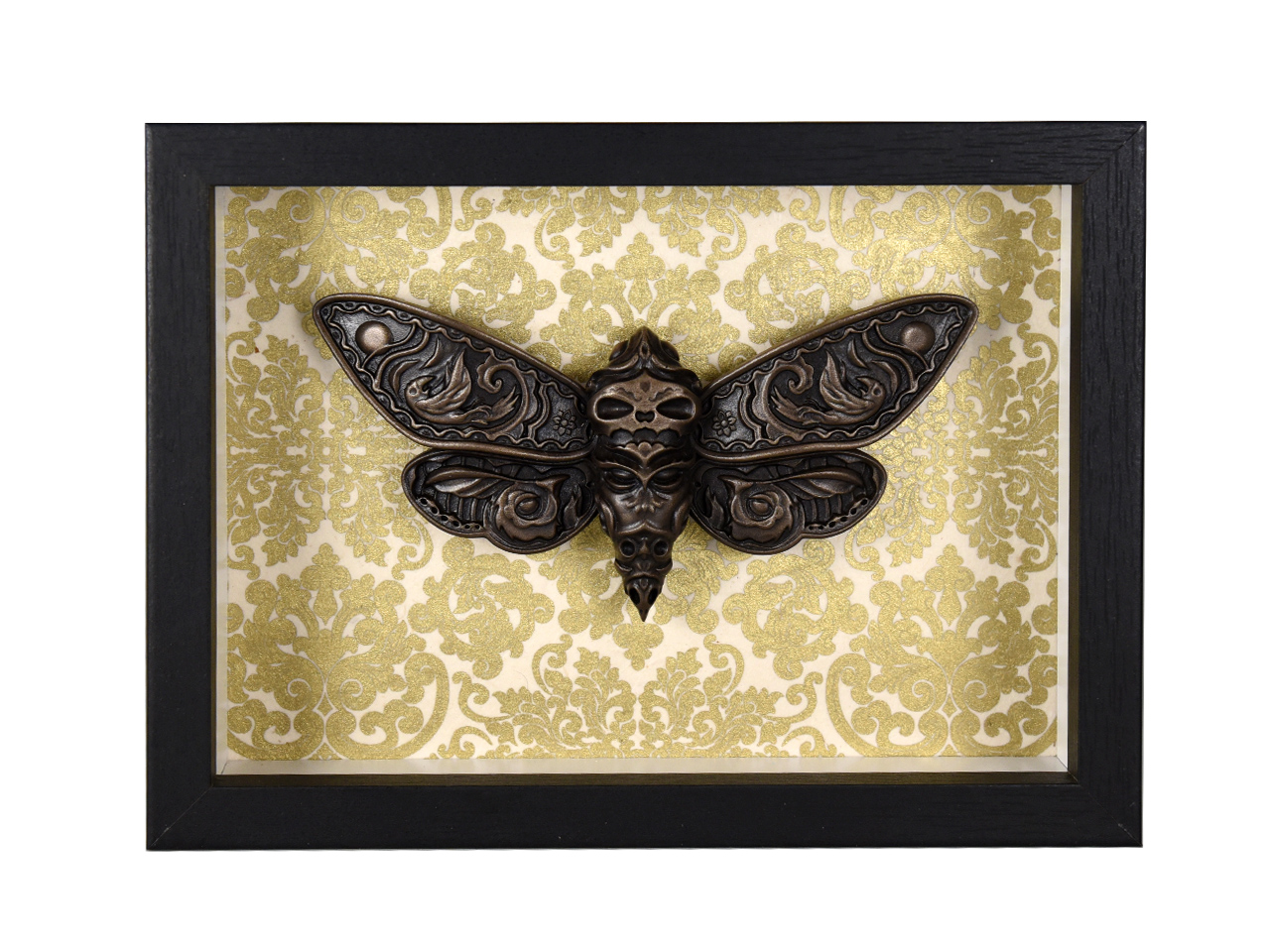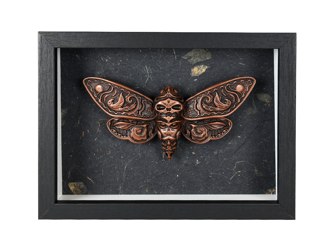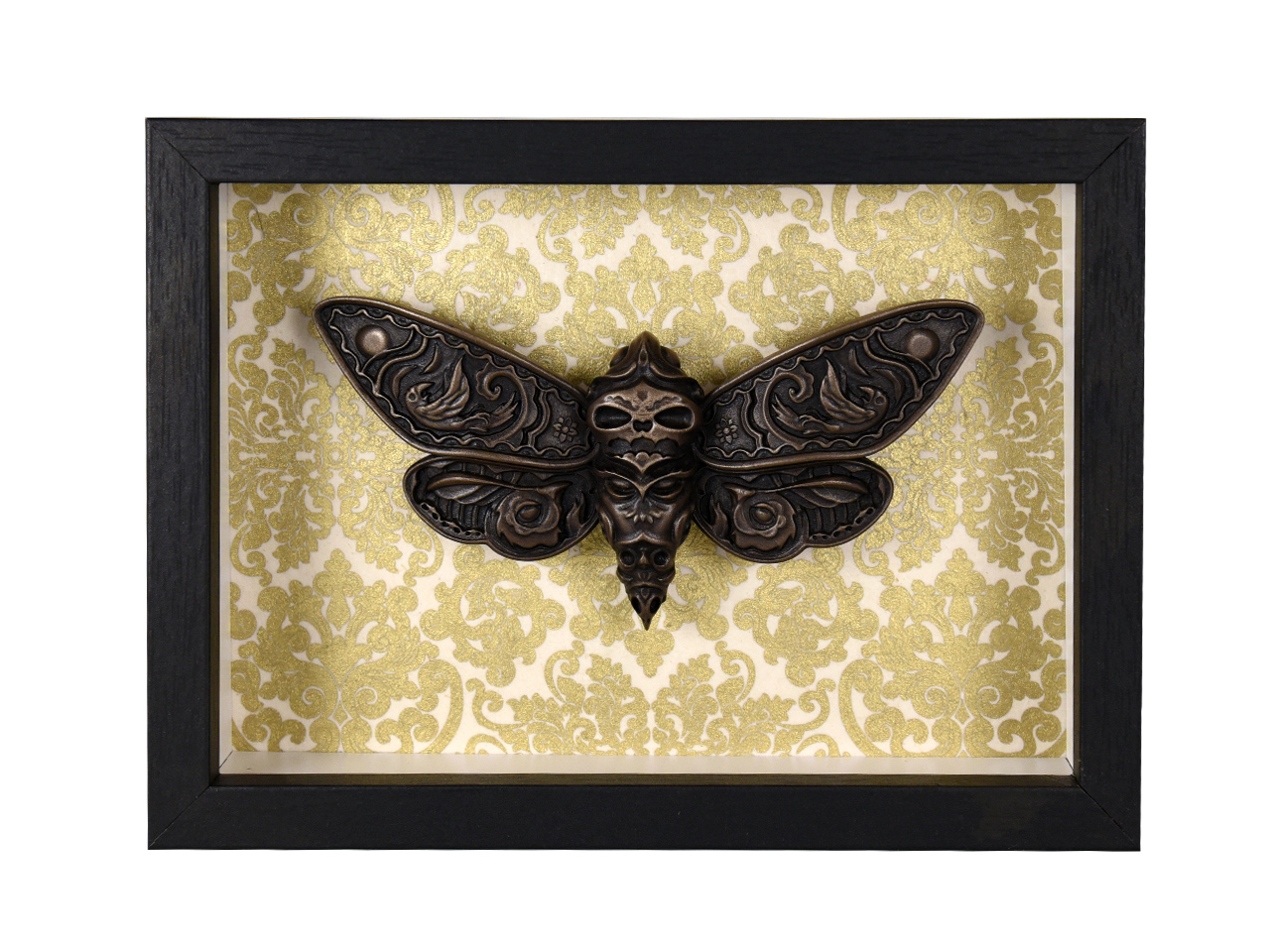 These smaller resin and metal editions of The Fall feature subtle finishes and softly curved wings. Mounted into a shadow box with natural paper backdrop, they exist somewhere between sculpture and specimen.