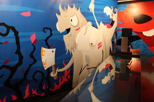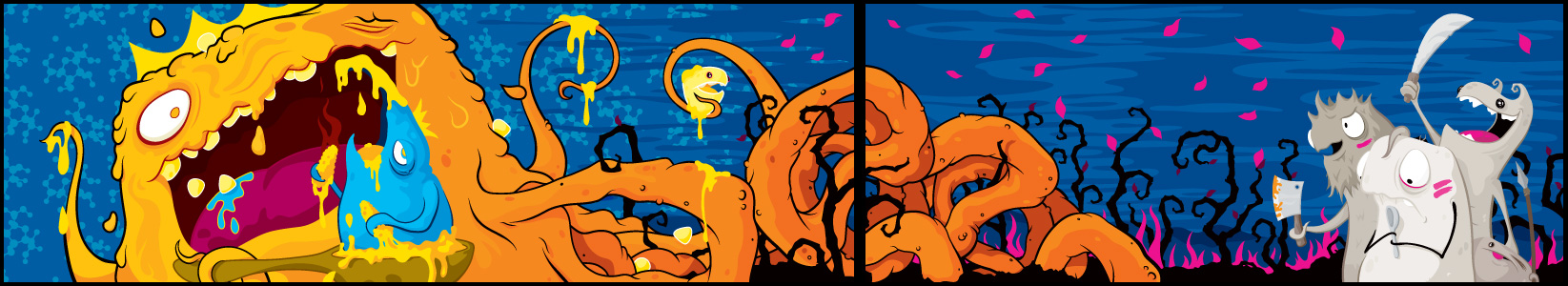 Artwork from the main wall, starts with a variant of King of Corn complete with high fructose molecules and ends with the hunters (mostly) ready for attack) Click for a larger version!