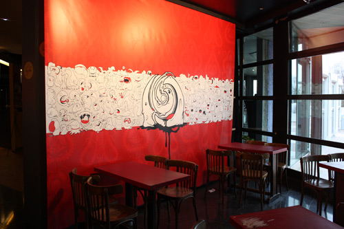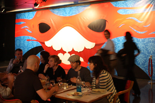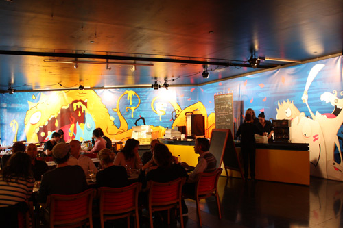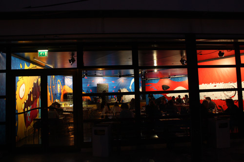 The walls were huge and flowed well into one another across the space. All the bright colors reflected on surfaces of tables, floors and ceilings adding to the fun.